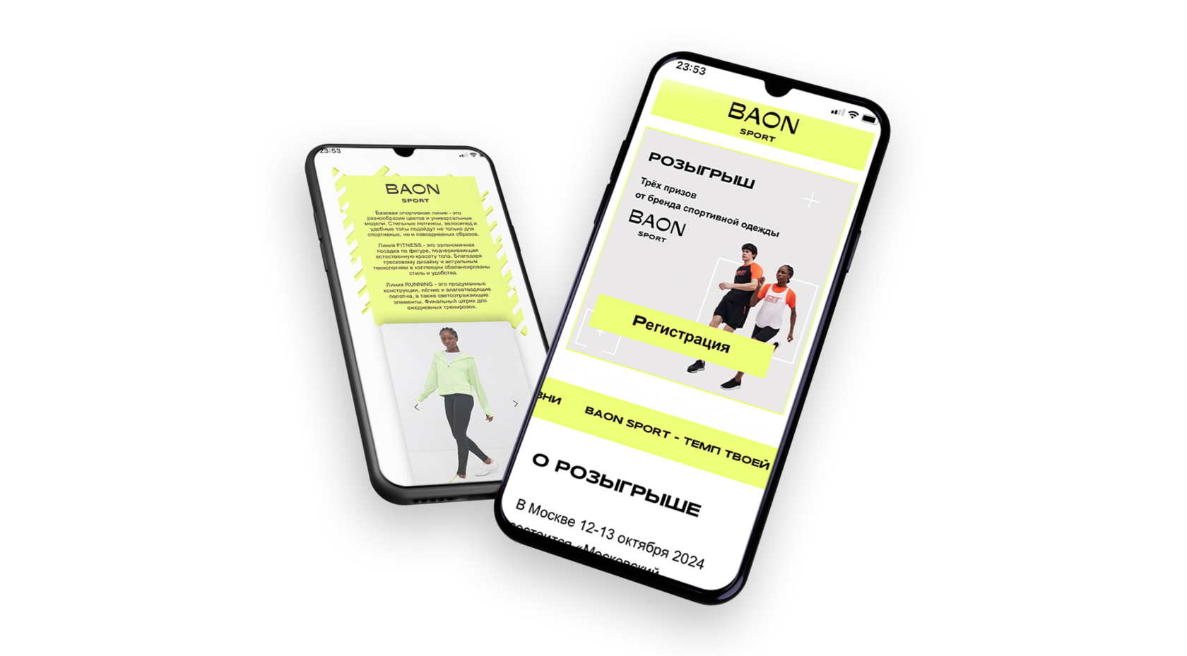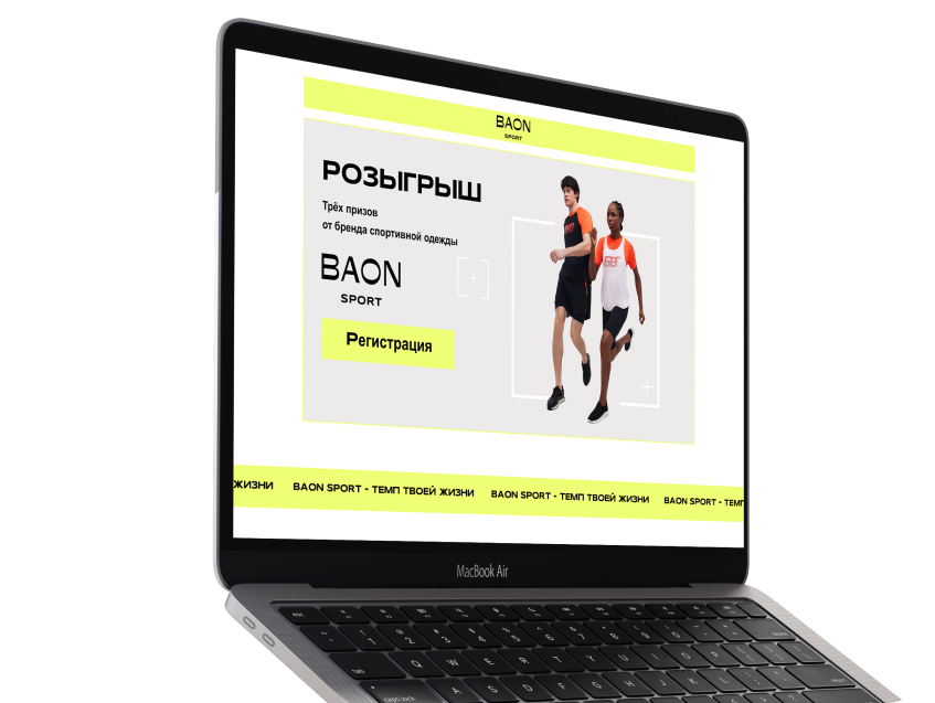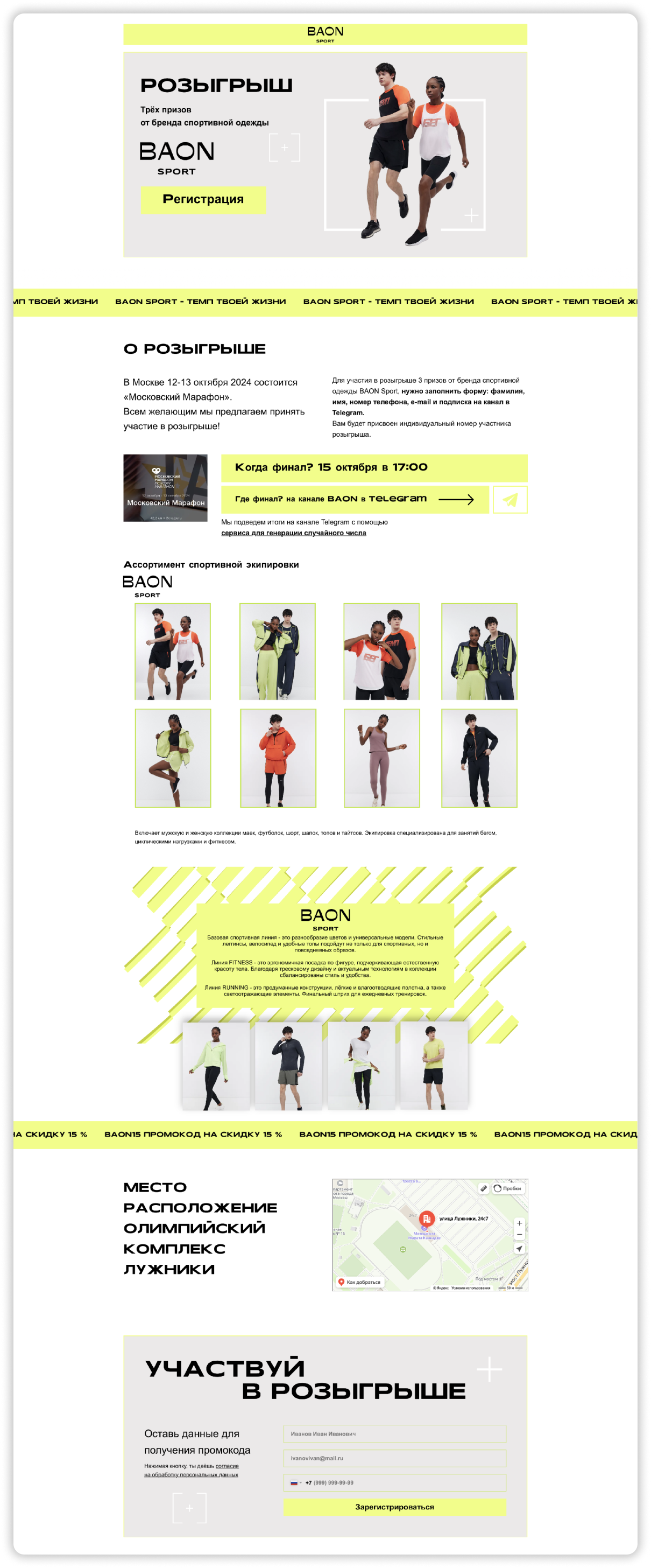 Образ страницы для бренда BAON отражает энергию спорта и профессионализм бренда, создавая динамичное, яркое и привлекательное пространство для взаимодействия с беговой аудиторией. Дизайн страницы подчеркивает дух движения, силы и достижений через насыщенные визуальные акценты, сочетающиеся с чистым и структурированным корпоративным стилем. Цель страницы — собирать контакты участников бегового события, поэтому интерфейс сконструирован с акцентом на простоту, удобство и скорость взаимодействия.