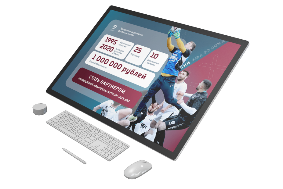 Для визуального оформления был выбран образ футболиста, который символизирует скорость, энергию и командную работу — ключевые элементы успешной франшизы. Яркие и динамичные элементы дизайна подчёркивали спортивную направленность.